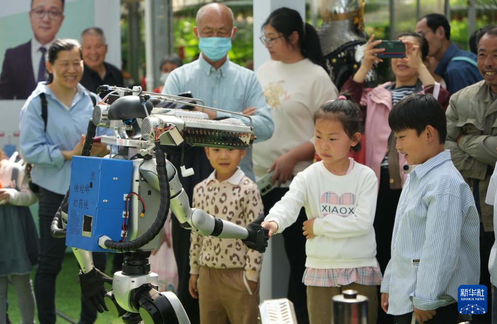 4月20日,在第二十六届中国(寿光)国际蔬菜科技博览会上,人们在观看农业机器人展示。