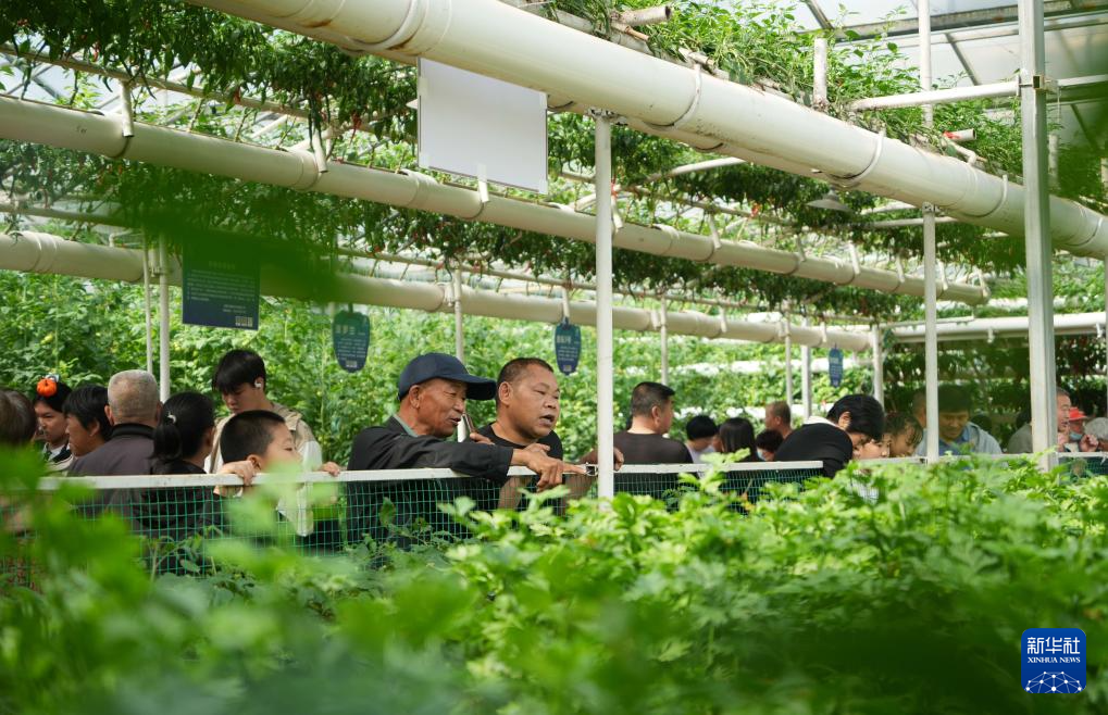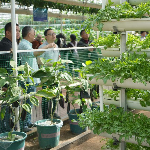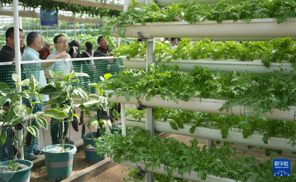 4月20日,在第二十六届中国(寿光)国际蔬菜科技博览会上,人们在观看先进种植模式展示。