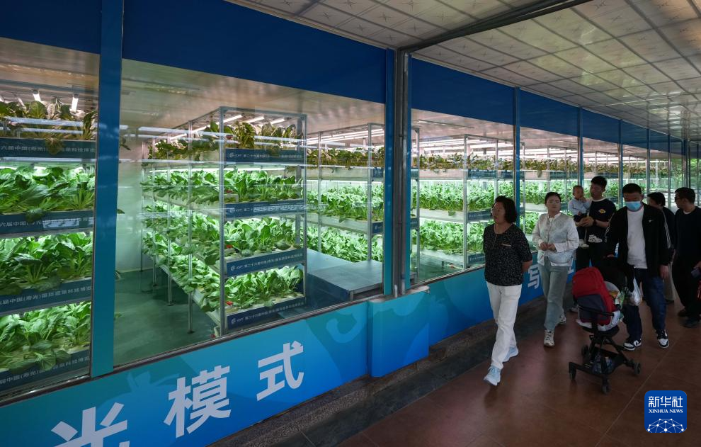 4月20日,在第二十六届中国(寿光)国际蔬菜科技博览会上,人们在观看植物工厂展示。