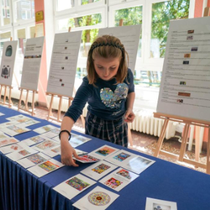 4月19日,一名女孩在波黑萨拉热窝举行的甘肃民间艺术展上挑选明信片。为庆祝“国际中文日”,以“中国非遗 世界共享”为主题的甘肃民间艺术展当天在波黑萨拉热窝大学哲学院开幕。