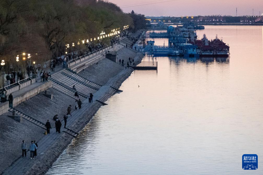 4月22日,人们在松花江哈尔滨段江畔漫步。