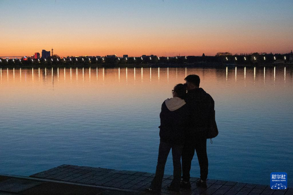 4月22日,一对情侣在松花江哈尔滨段江畔欣赏日落后的江景。
