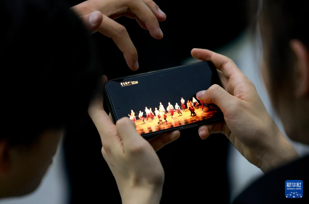 4月14日,罗昊(左)和同学在排练间隙观看手机视频沟通舞蹈动作。