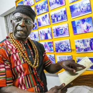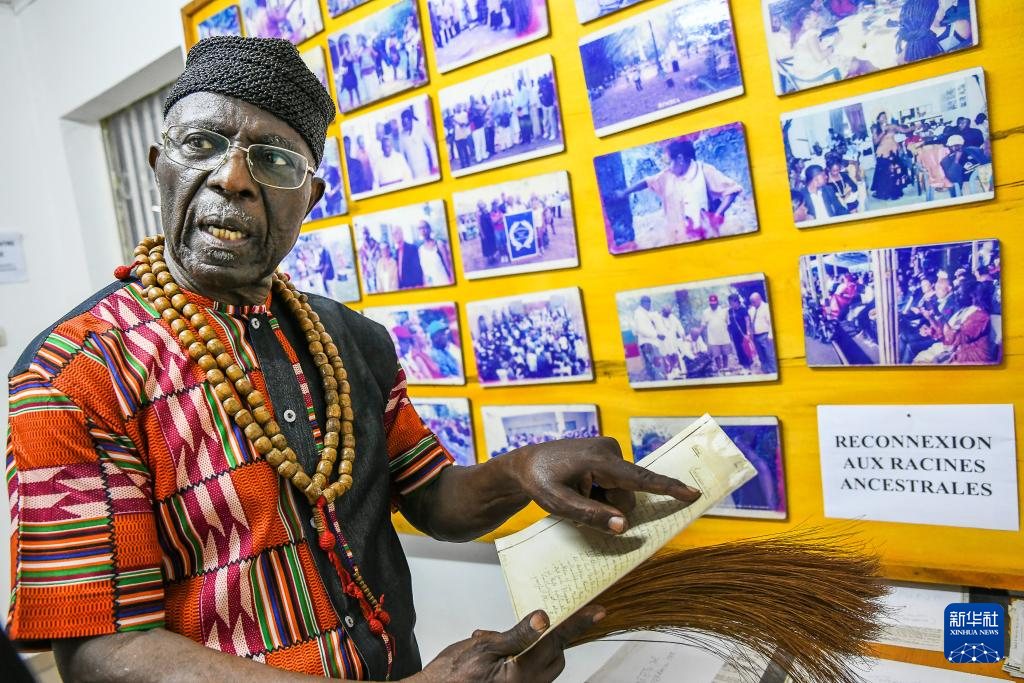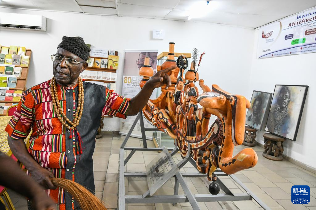 3月17日,在喀麦隆杜阿拉,喀麦隆著名作家亚历山大·库马·恩敦贝三世介绍喀麦隆传统艺术品。