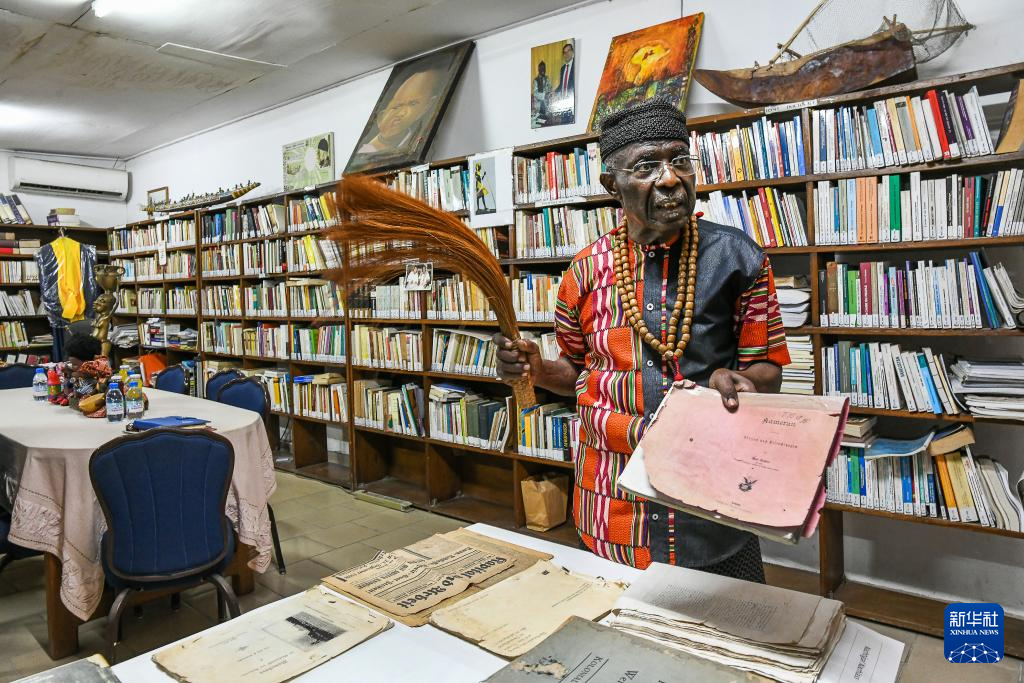 3月17日,在喀麦隆杜阿拉,喀麦隆著名作家亚历山大·库马·恩敦贝三世展示有关喀麦隆历史的档案文件。