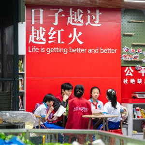 4月23日,学生在长沙华夏农贸市场“四点半角”写作业。