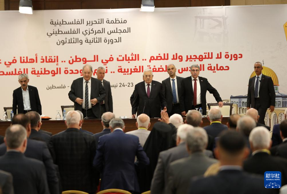 4月23日,巴勒斯坦总统阿巴斯(中)在约旦河西岸城市拉姆安拉出席巴勒斯坦解放组织(巴解组织)中央委员会第32次会议。