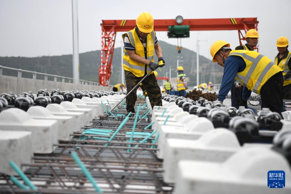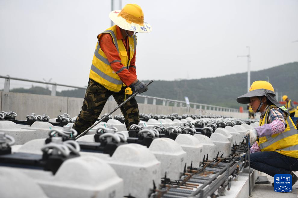 4月24日,在安徽省马鞍山市含山县,中铁四局施工人员在进行巢马城际铁路无砟轨道板铺设施工。