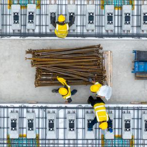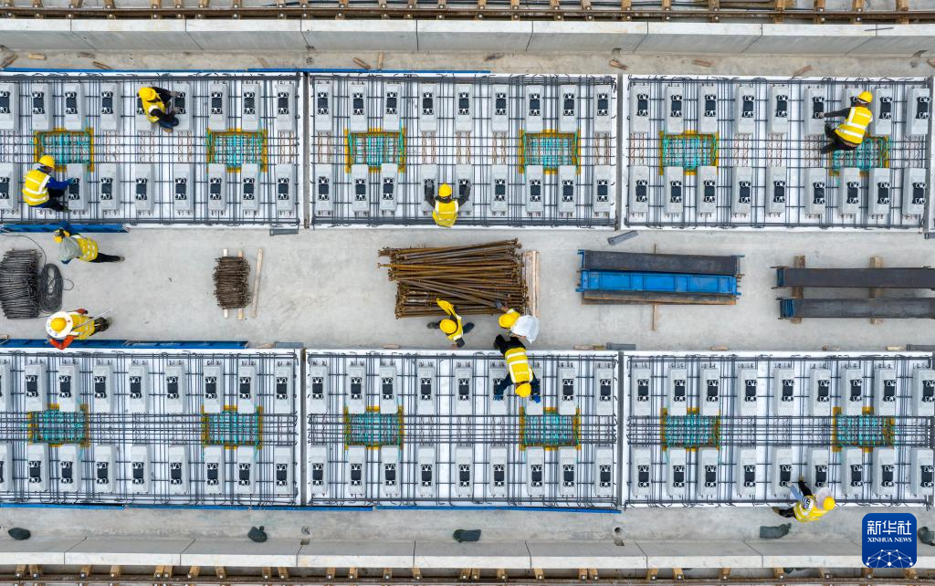 4月24日,在安徽省马鞍山市含山县,中铁四局施工人员在进行巢马城际铁路无砟轨道板铺设施工(无人机照片)。