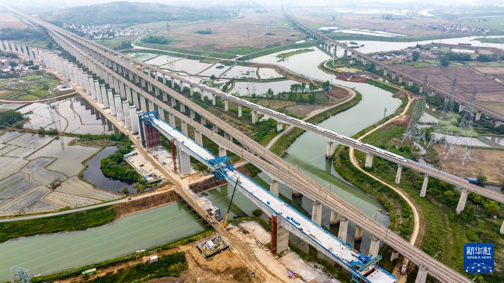 这是中铁四局巢马城际铁路跨清溪河特大桥连续梁施工现场(4月24日摄,无人机照片)。
