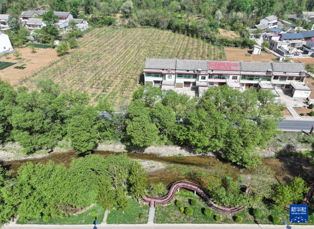 洛南县以核桃树为主题打造的桃悠谷景区景色(4月23日摄,无人机照片)。