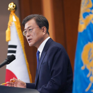 这张拍摄于2020年5月10日的资料照片显示,时任韩国总统文在寅在韩国首尔青瓦台发表讲话。