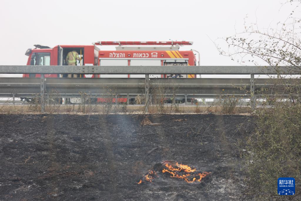 4月23日,消防车在以色列中部城市卢德附近参与灭火。