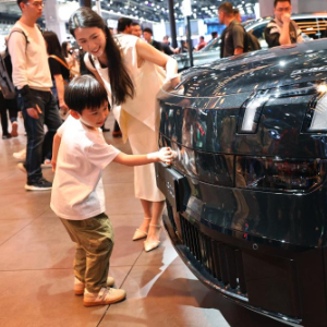 4月25日,小朋友与领克汽车上显示的小猫图案互动。