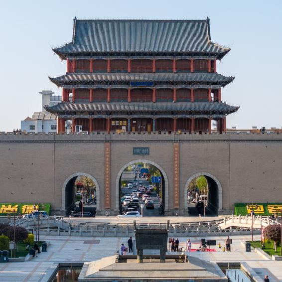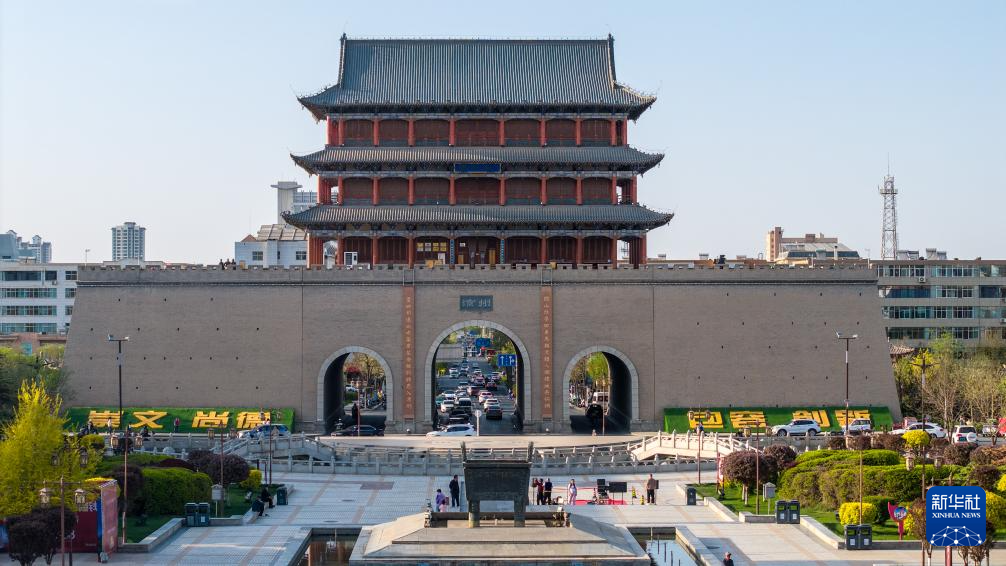 这是4月24日在武威市凉州区拍摄的武威南城门及广场(无人机照片)。
