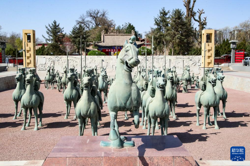 这是4月24日在武威市凉州区拍摄的雷台汉墓景区铜奔马雕塑。