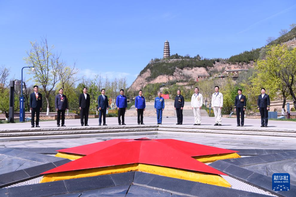 这是“人民工匠”许振超(左七)等在陕西延安宝塔山劳模致敬仪式拍摄现场(4月24日摄)。