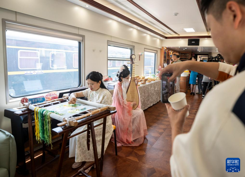 4月25日,在“南方列车·潇湘号”旅游专列上,旅客在观看表演。