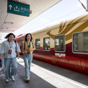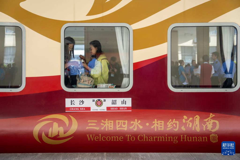 当日,湖湘主题旅游专列“南方列车·潇湘号”从长沙首发开往韶山。据了解,该专列由广铁集团与湖南旅游集团联合打造,将湖湘历史人文、非遗技艺、特色美食等元素融入车厢设计,让旅客在旅途中沉浸式感受湖湘文化。