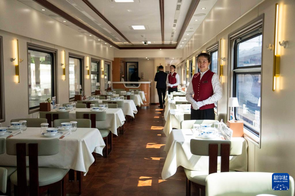 4月25日,在“南方列车·潇湘号”旅游专列上,乘务人员在等待旅客上车。