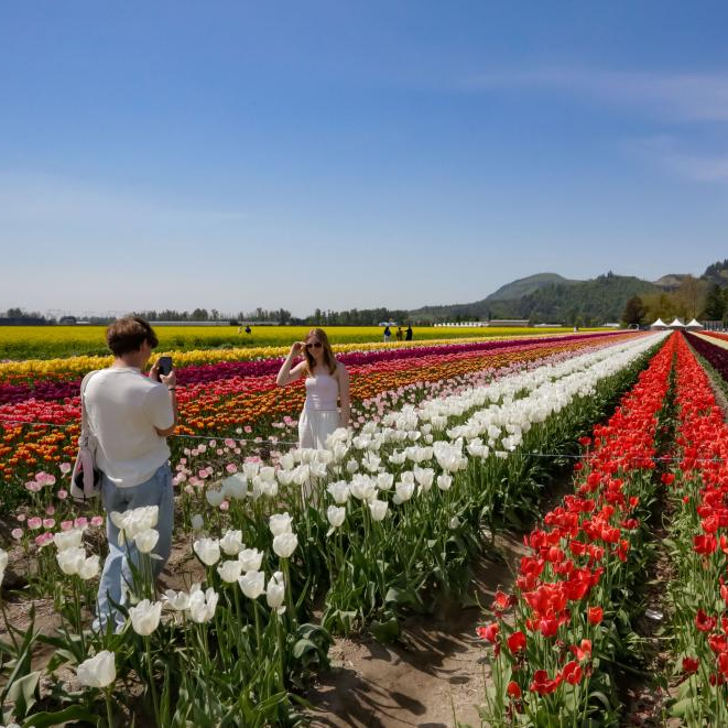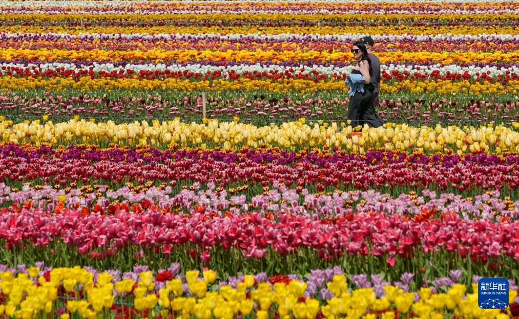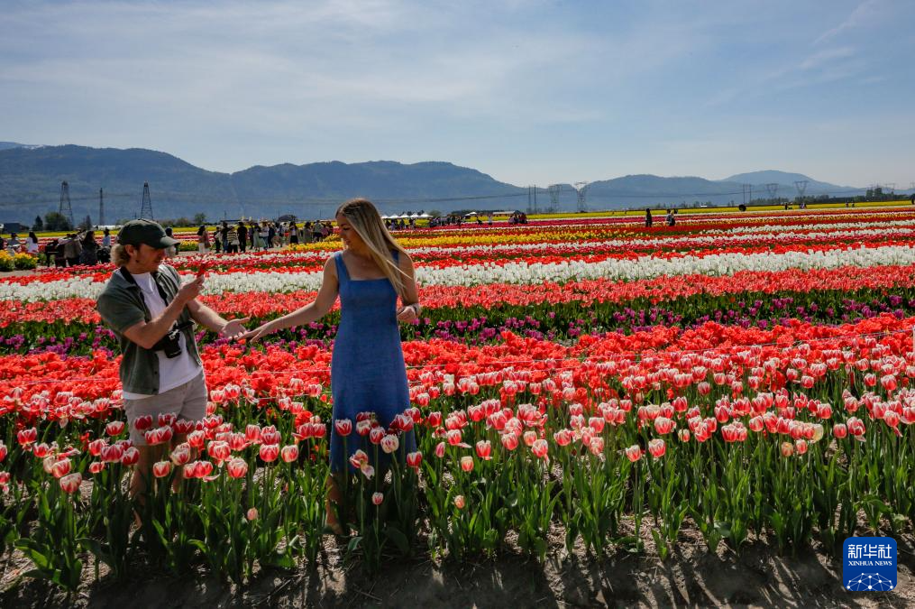 4月25日,在加拿大阿伯茨福德市,人们在郁金香田中漫步。