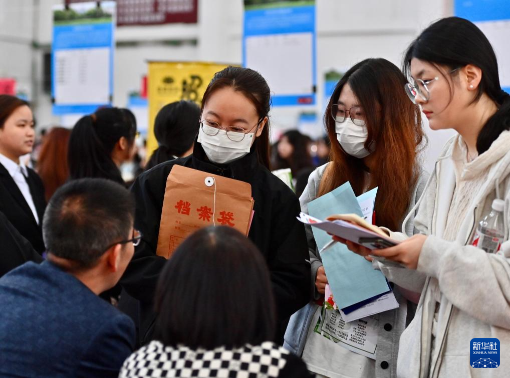 4月26日,在招聘会现场,用人单位工作人员和学生交流。