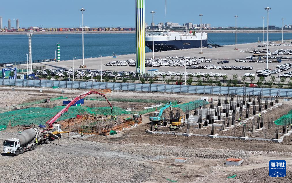 4月25日拍摄的天津港环球滚装码头汽车物流堆场工程建设现场(无人机照片)。