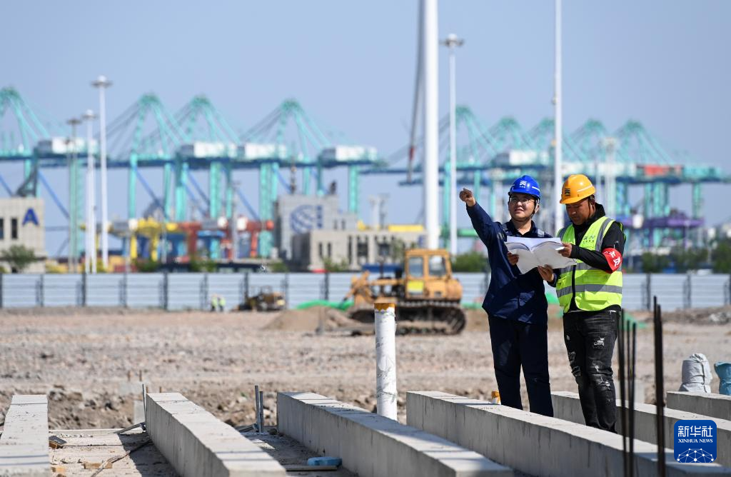 4月25日,在天津港环球滚装码头汽车物流堆场工程建设现场,工作人员对照设计图纸观察工程建设。