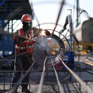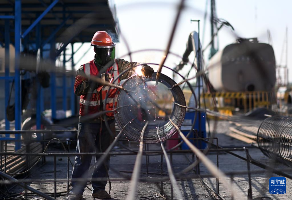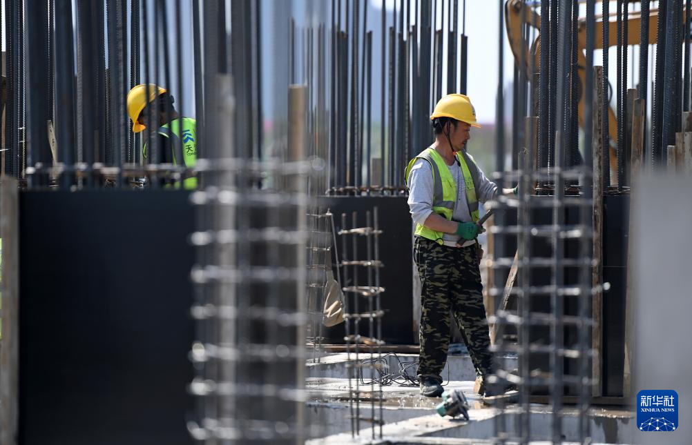 4月25日,工人在天津港第一港埠有限公司散粮三期新建筒仓工程建设现场施工。