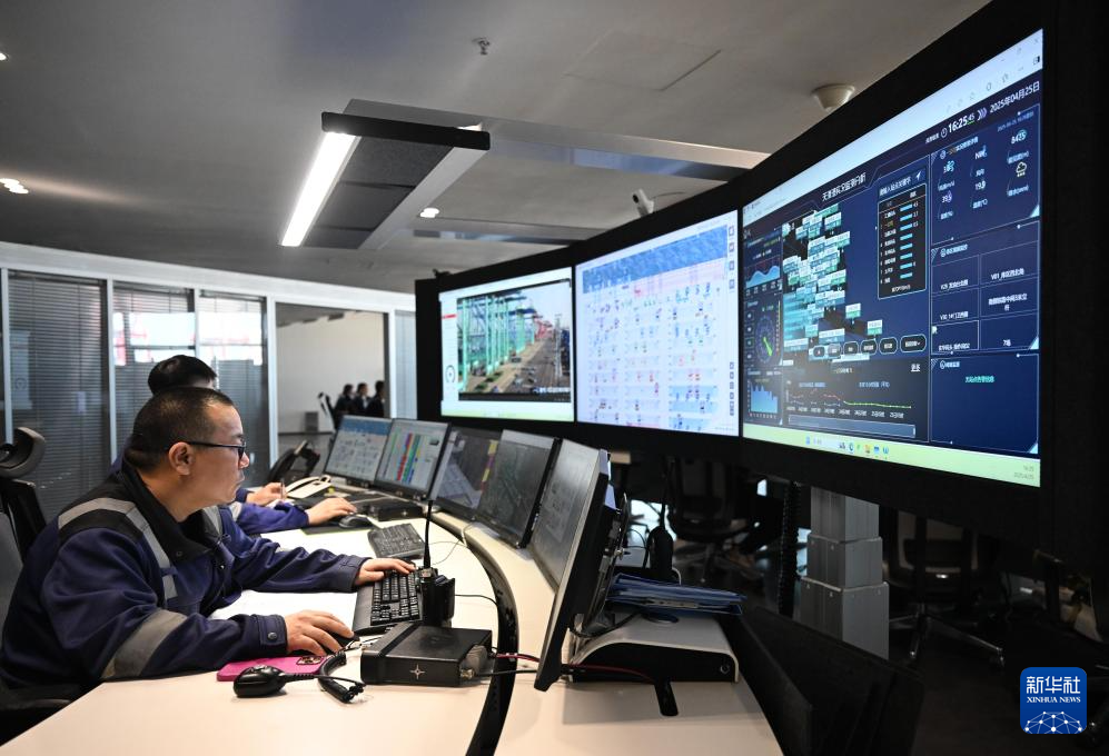 4月25日,在天津港第二集装箱码头有限公司智控中心,工作人员远程调试码头设备。
