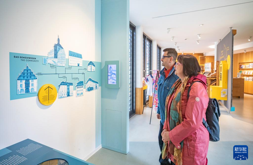 3月24日,在德国班贝格古城,班贝格世界遗产中心主任西蒙娜·冯·艾布介绍中心内展览的互动装置。