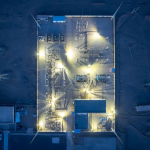 这是4月26日拍摄的位于内蒙古阿拉善盟额济纳旗哈日布日格德音乌拉镇的黑鹰山供电所(无人机照片)。