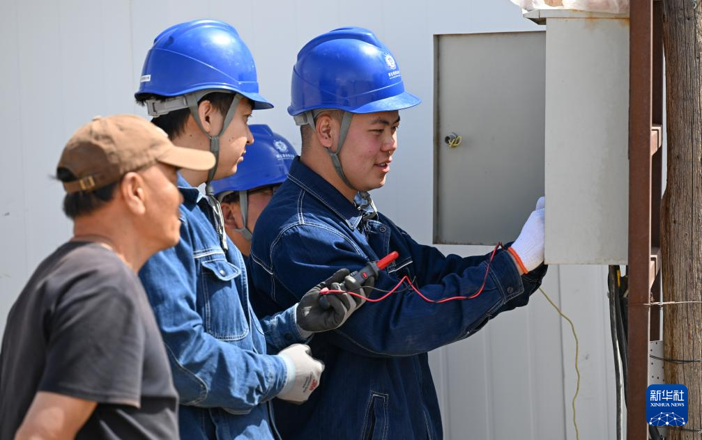 4月26日,在内蒙古阿拉善盟额济纳旗哈日布日格德音乌拉镇,黑鹰山供电所工作人员在一户牧民家检查配电箱运行情况。