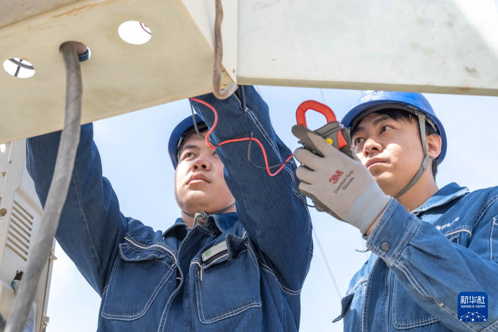 4月26日,在内蒙古阿拉善盟额济纳旗哈日布日格德音乌拉镇,黑鹰山供电所的工作人员在检修电路。