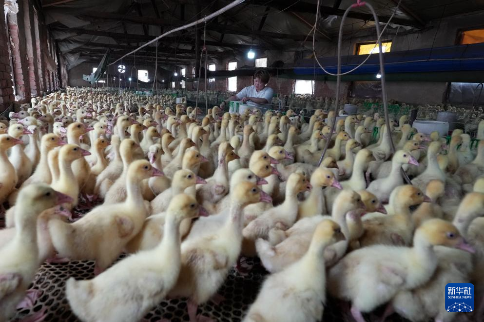 4月26日,昌黎县安山镇大田庄村一家育雏场的工人在给鹅雏投放饲料。