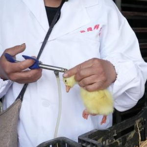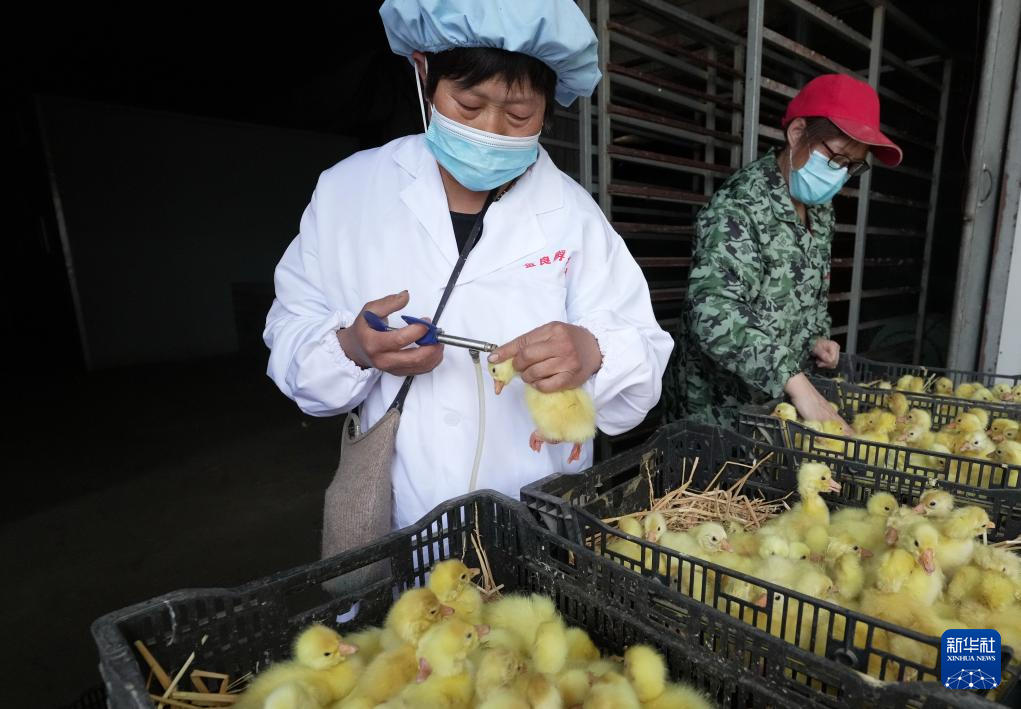 4月26日,昌黎县安山镇大田庄村一家育雏场的工人在给鹅雏注射防疫疫苗。