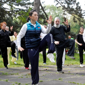4月26日,中国首都体育学院副教授李凤梅(左三)在罗马尼亚布加勒斯特与当地太极爱好者参加“世界太极日”活动。