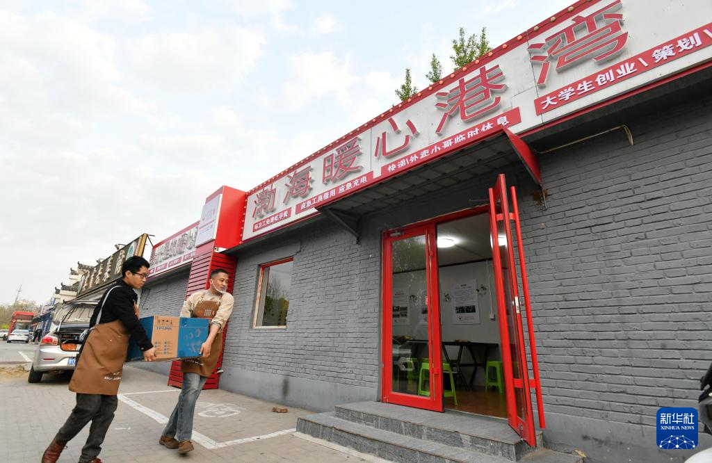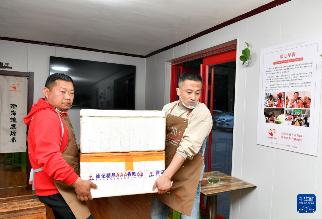 4月21日,吴玉良(右)和志愿者伙伴将采购的物品搬进河北沧州渤海新区黄骅市“渤海暖心港湾”。