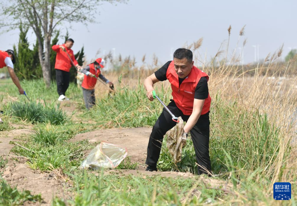 4月20日,吴玉良(前)和志愿者伙伴在河北沧州渤海新区黄骅市石碑河捡拾垃圾。