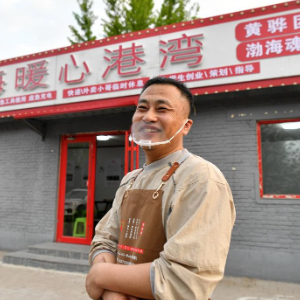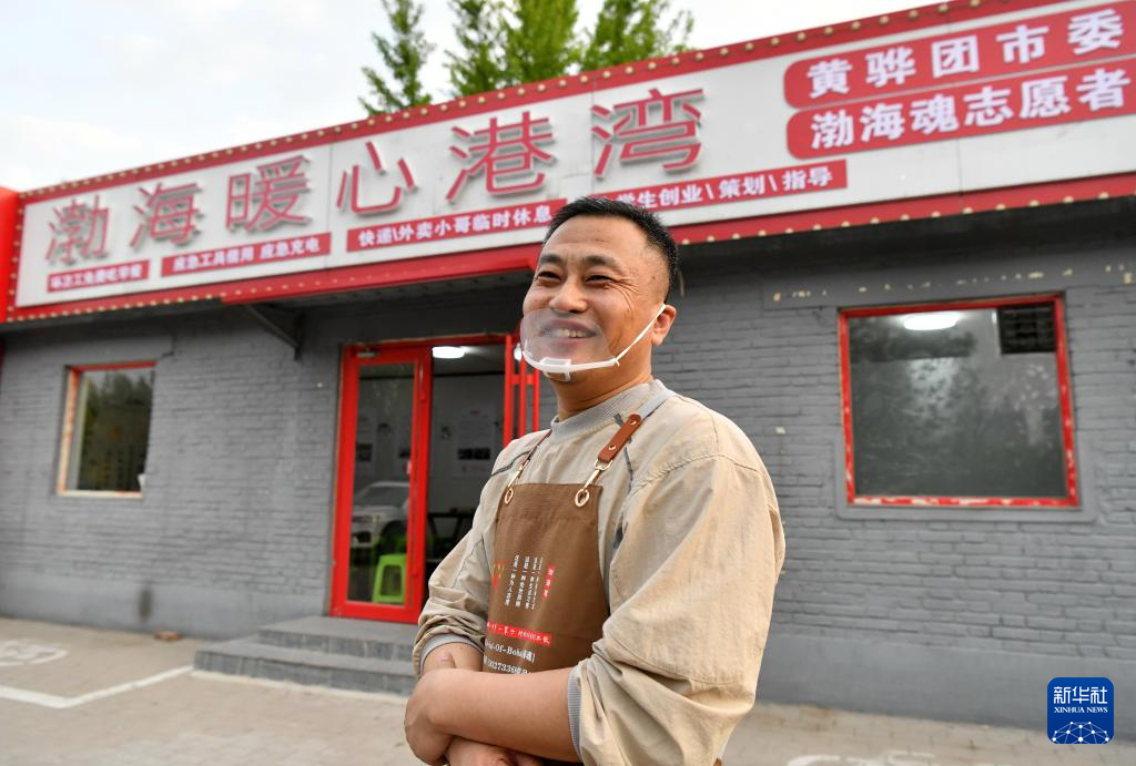 4月21日,吴玉良在河北沧州渤海新区黄骅市“渤海暖心港湾”门前迎接准备来吃早餐的环卫工人。
