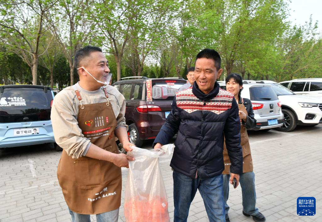 4月21日,吴玉良(左)在河北沧州渤海新区黄骅市“渤海暖心港湾”门前接受爱心人士送来的小米。