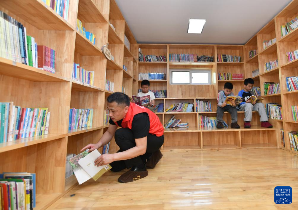 4月20日,吴玉良(前)在他负责管理的河北沧州渤海新区黄骅市一间社区书屋内整理图书。
