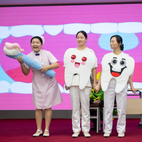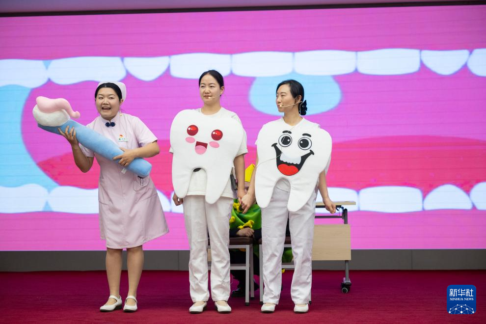 4月29日,北京按摩医院(朝阳院区)口腔科护理人员在比赛中演出英语情景剧《牙齿保卫战》。