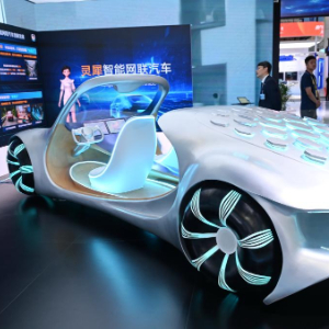 4月29日在第八届数字中国建设峰会现场体验区拍摄的灵犀智能网联汽车。