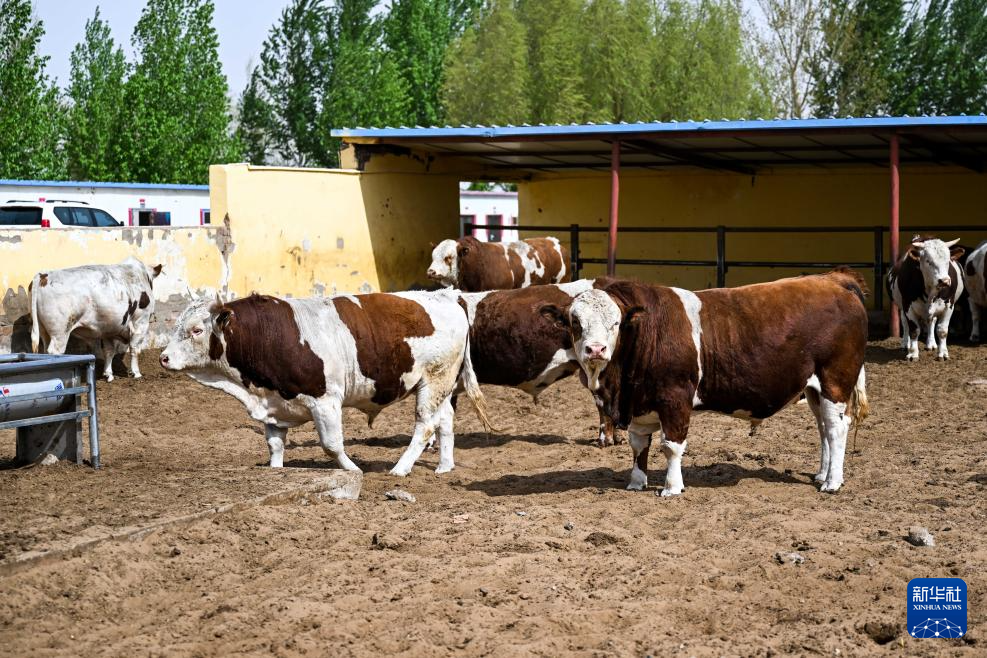 4月29日,工作人员在杭锦旗一家肉牛养殖企业查看肉牛生长情况。