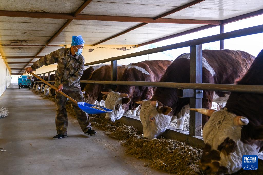4月29日,工人在杭锦旗一家肉牛养殖企业喂牛。
