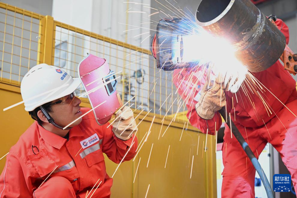 4月29日,在位于海油工程天津智能制造基地的工作室,刘海林(左)和同事对一款新型焊接材料进行试验焊接。