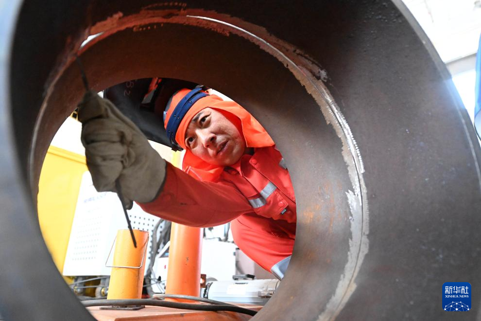 4月29日,刘海林在位于海油工程天津智能制造基地的工作室检查一处焊缝。