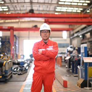 这是4月29日在海油工程天津智能制造基地车间拍摄的刘海林肖像。