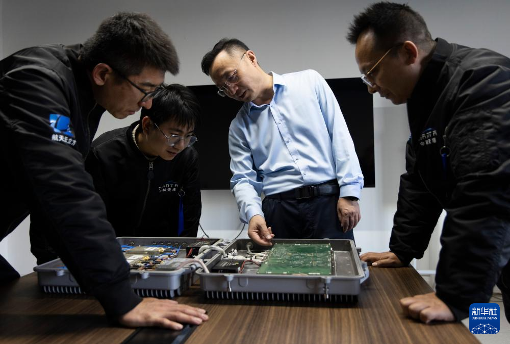 2024年10月23日,在位于西安的中科天塔会议室,曾伟刚(右二)和同事讨论卫星测控数传一体化处理平台——天枢G100。